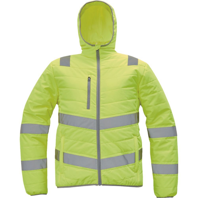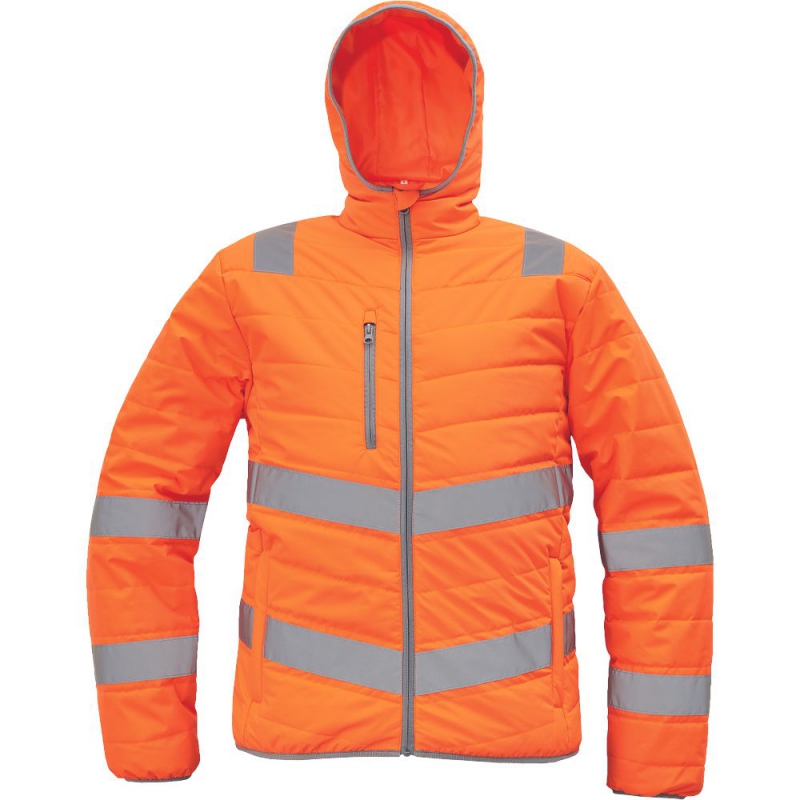 zateplená pánská zimní bunda s HI-VIS reflexními pruhy a kapucí; 2 boční kapsy na zip, 1 hrudní kapsa na zip, 1 vnitřní kapsa na zip; elastické paspulky na obvodu rukávu, kapuce a spodního lemu.