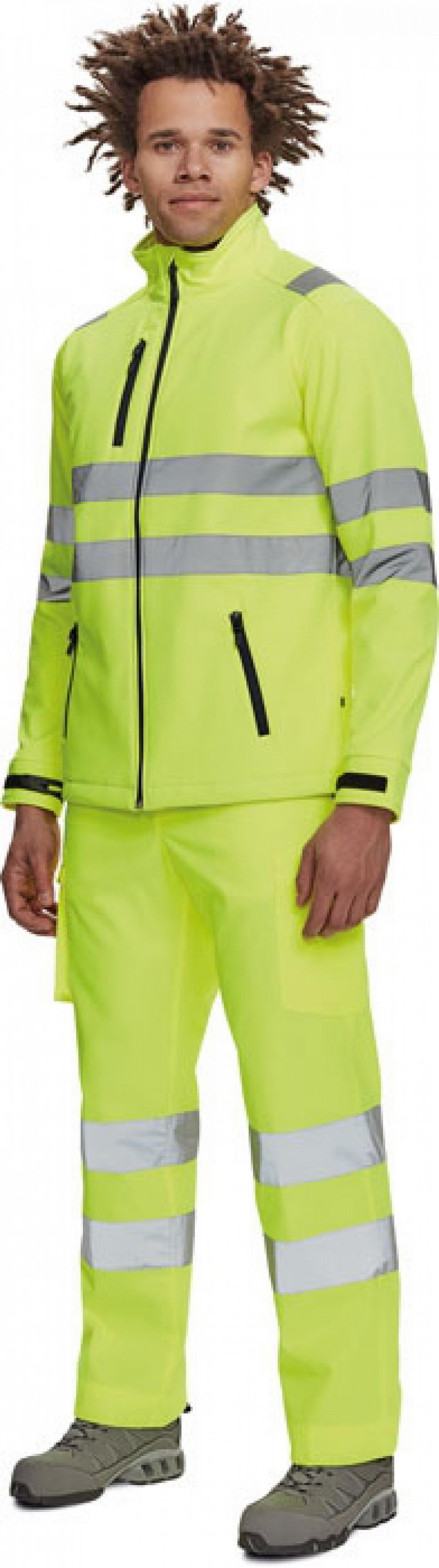 pánská Hi-Vis softshellová bunda s TPU membránou, zapínání na zip, nastavitelná šíře obvodu rukávů na suchý zip, reflexní pruhy na ramenou, rukávech a spodní části o velikosti 5 cm, 1 náprsní kapsa a 2 boční kapsy na zip