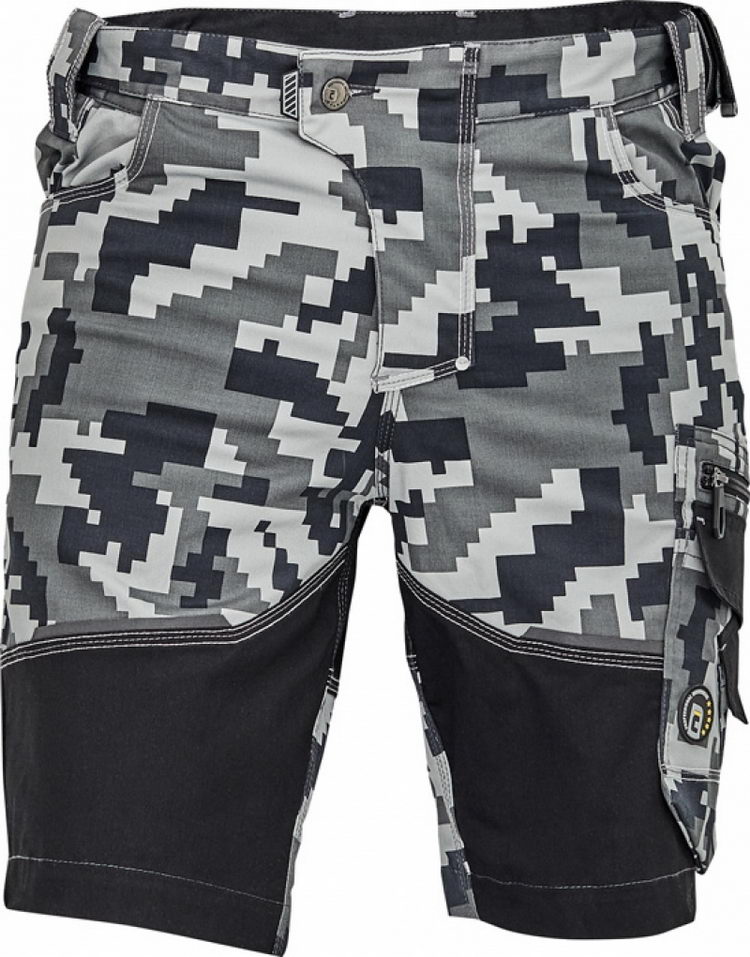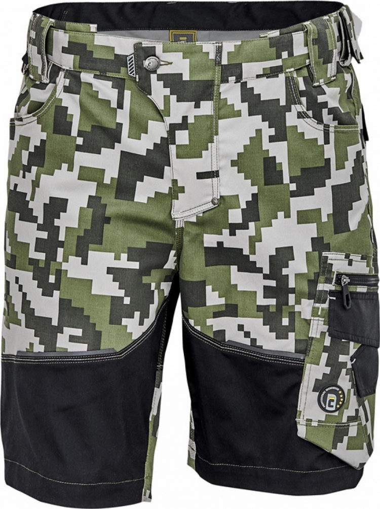 pánské pracovní šortky, elastický inovativní materiál TRIFIBETEX® v přírodním maskování, ergonomický střih, snížený pružný pas, odolné trojité prošití nohavic a sedu, prostorné multifunkční přední kapsy s poutky na nářadí, 2 zadní kapsy na suchý zip, stehenní kapsa na telefon s klopou a zapínáním na suchý zip, kapsa na metr a nůž, poutko na kladivo, "D" kroužek, poutko na nářadí v pase, originální zpracování zapínání kalhot, reflektivní prvky v barevném odstínu.