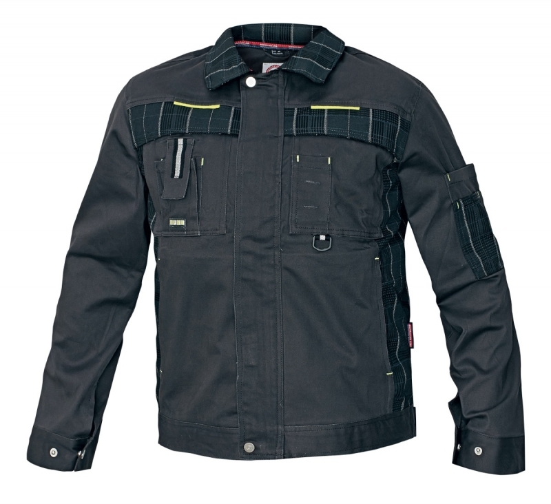 montérková bunda pohodlného střihu z příjemného strečového materiálu • kárované a signální žluté doplňky • celokovový zip a druky • kapsa na ID kartu.