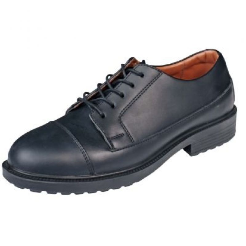 Bezpečnostní pracovní obuv pro manažery, s ocelovou tužinkou, stélkou proti propíchnutí, PU podrážkou rezistentní pohonným hmotám a svrškem z lícové kůže.
