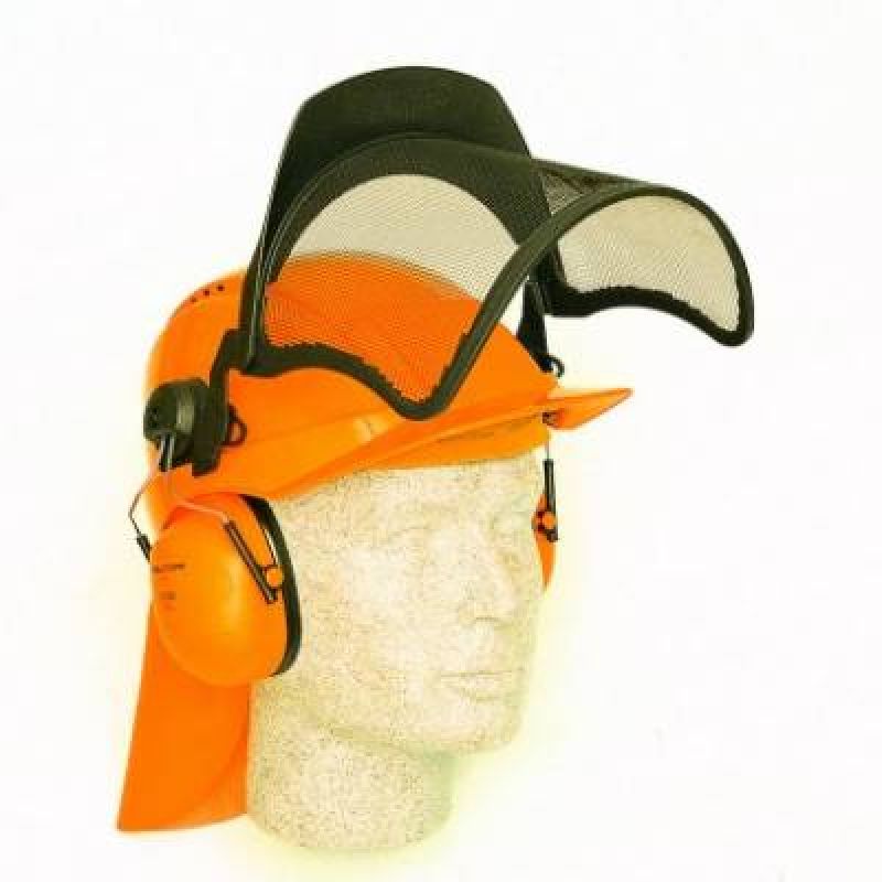 Lesnický komplet, přilba Peltor G2000 + mušlový chránič sluchu H31P3K s odklopnou drátěnou mřížkou a plachetkou na zátylku.