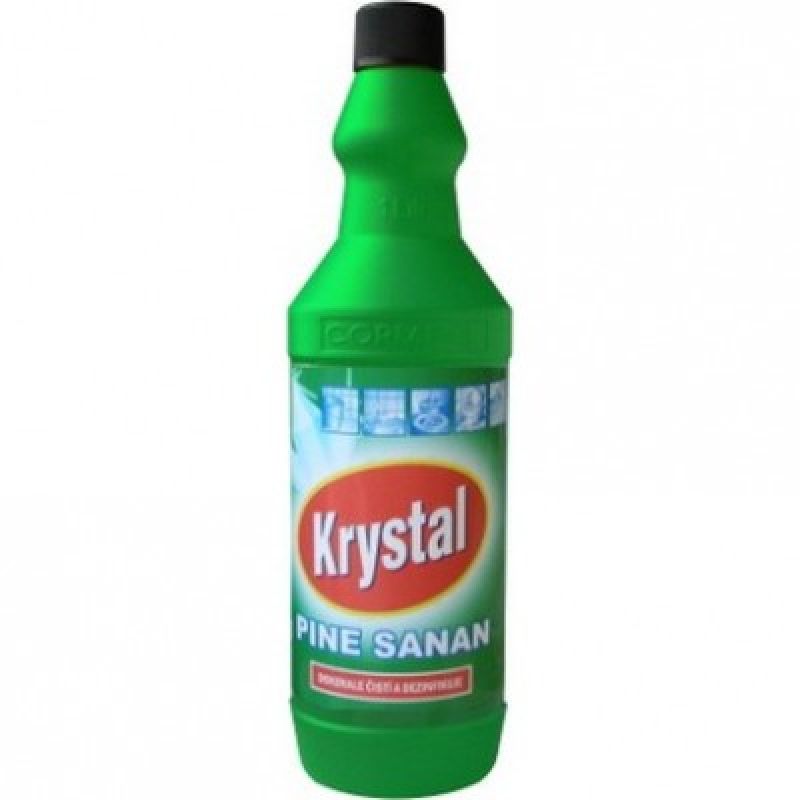 Krystal PINE SANAN je vysoce účinný čistící prostředek s dezinfekčním (zničí všechny bakterie) a bělícím účinkem. Synergický účinek směsi tenzidů a přísady s bělícími vlastnostmi předurčuje tento výrobek k širokému použití. Je vhodný zejména na záchodové mísy a pisoáry, umyvadla, vany, dřezy, podlahy kachličky, pracovní plochy a odpady.