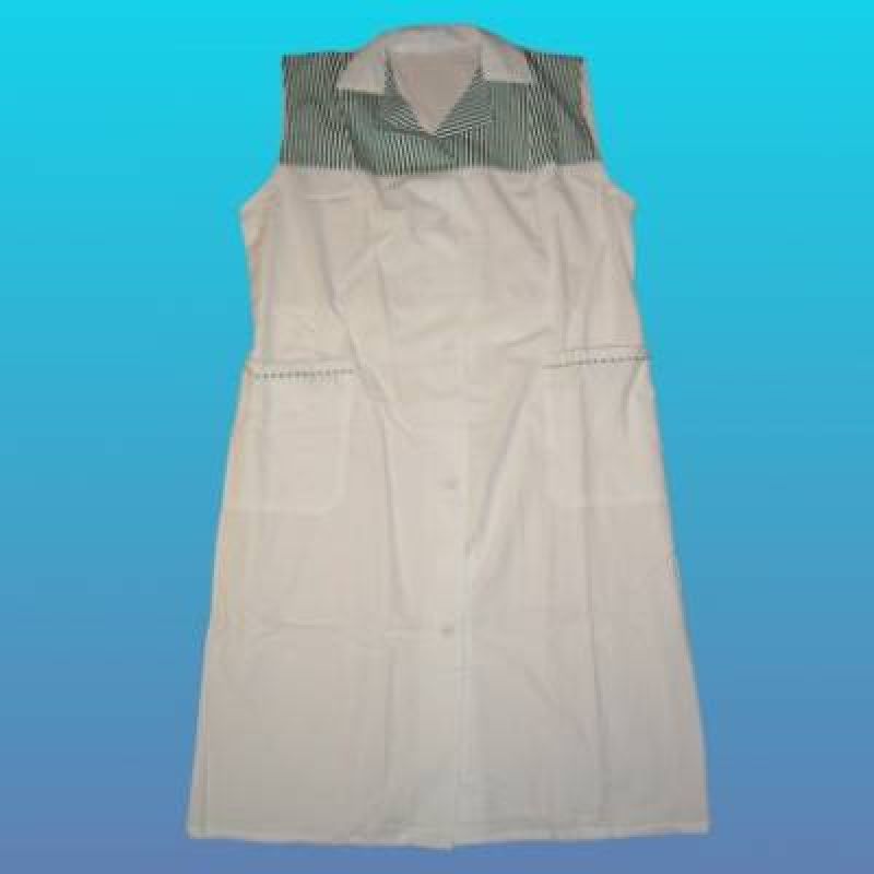 Bílý domestikový plášť s barevnými doplňky, vhodný například k rozlišení jednotlivých středisek v podnicích.