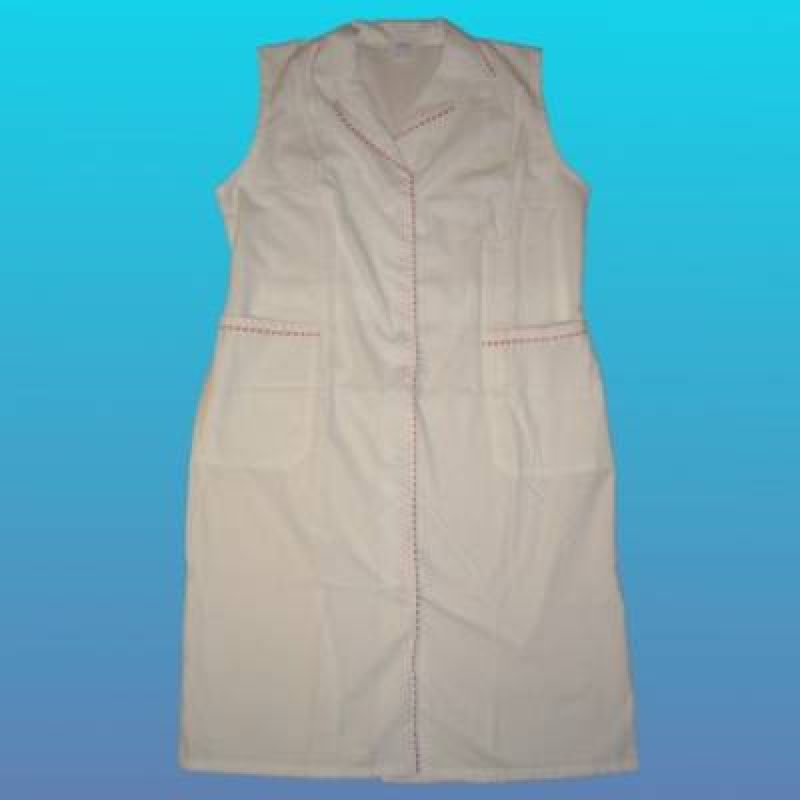 Bílý domestikový plášť s barevnými doplňky, vhodný například k rozlišení jednotlivých středisek v podnicích.