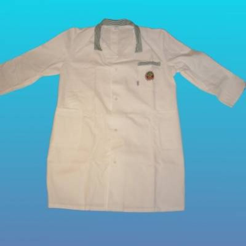 Bílý keprový plášť s barevnými doplňky, vhodný například k rozlišení jednotlivých středisek v podnicích.
