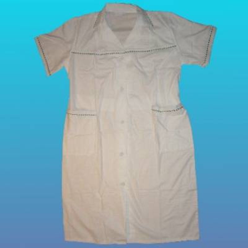 Bílý domestikový plášť s barevnými doplňky, vhodný například k rozlišení jednotlivých středisek v podnicích.