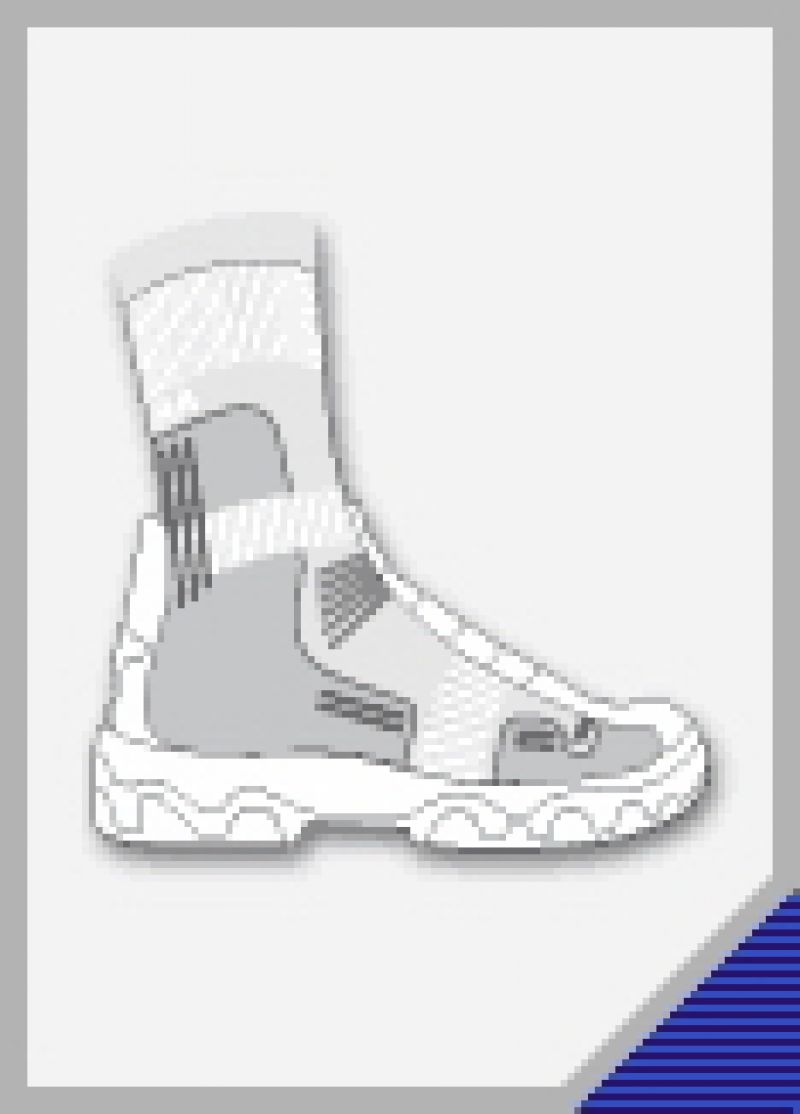 Střihové řešení: drenážní příze z pětiramenných vláken. Sanitized - nevypratelný přípravek ničící mikroorganismy.Zpevněný nárt a kotník bránící posouvání (Lycra). Zesílená pata (prodloužená nad kotník) a špice.