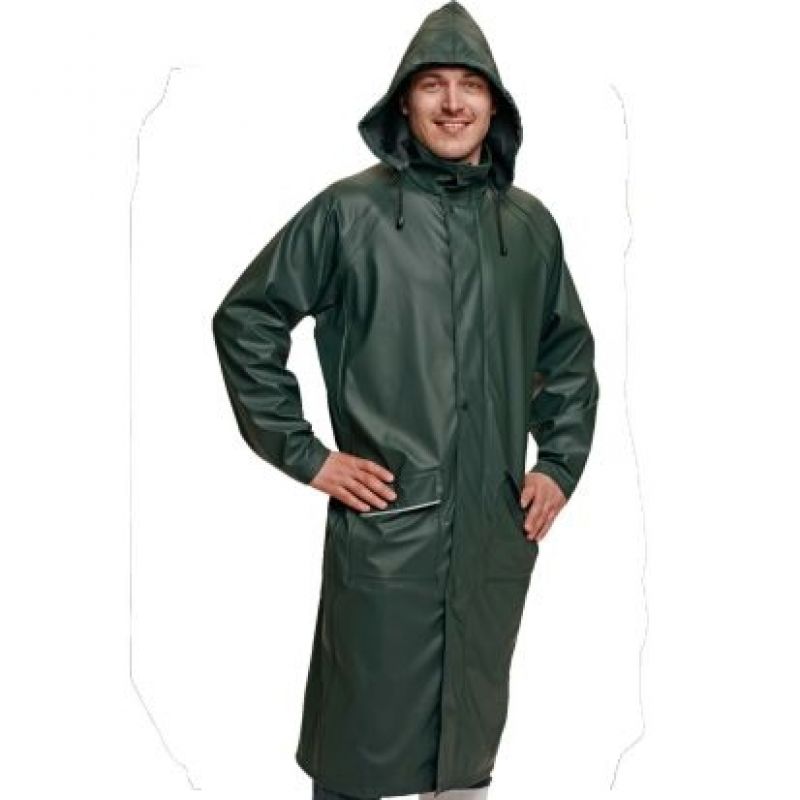 Nepromokavý 3 plášť s kapucí v límci, délka 120 cm, vodní sloupec 2000 mm. Kryté zapínání zipu a překryté kapsy. Lehký, nešustivý, flexibilní materiál, příjemný na dotek.