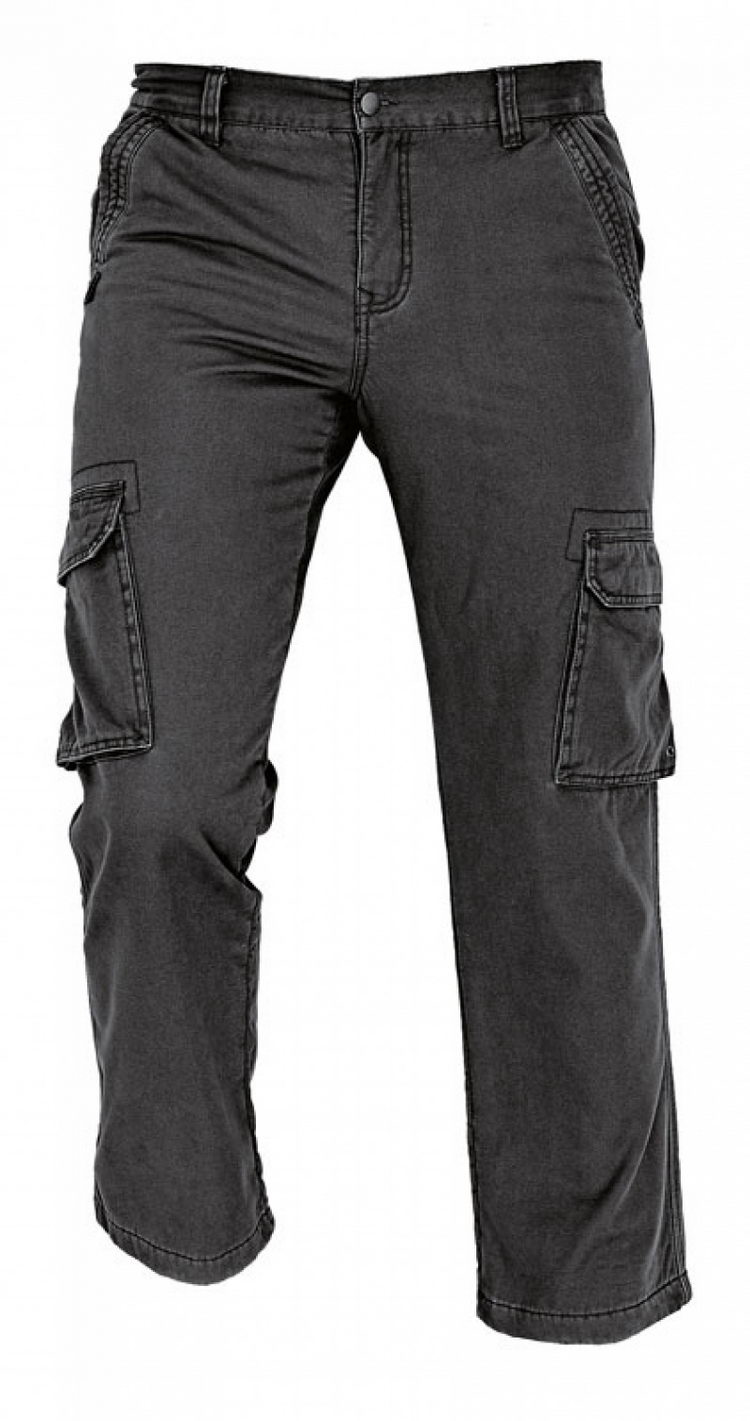 Pánské zateplené kargo kalhoty, svrchní materiál 100 % bavlna kanvas 235 g /m², vnitřní strana 100 % polyester fleece – 160 g /m², 2 kargo kapsy po stranách nohavic, 2 přední lištové kapsy, 2 zadní kapsy s patkou na druk, dekorativní prošití, padnoucí střih.