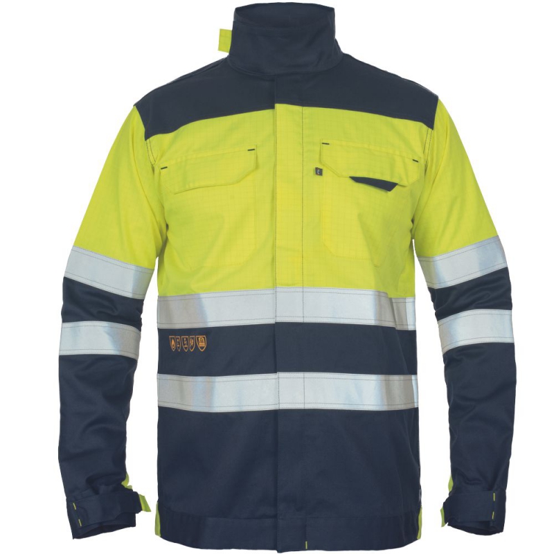 HI-VIS multinormní bunda se zapínáním na zip krytým légou na suchý zip; 2 náprsní kapsy s klopou na suchý zip; dvojice 5 cm šitých reflexních pruhů okolo rukávů a boků; nastavitelný obvod manžet rukávů o límce pomocí suchého zipu.