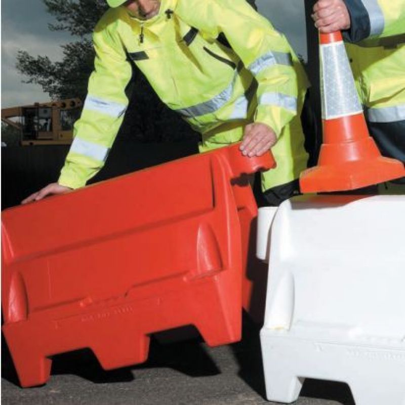 Silniční plastová bariéra spojovatelná pod různými úhly až do 45°, ne pouze přímým spojením, vysoce stabilní díky možnosti naplnění vodou, je stohovatelná čímž šetří místo při skladování, s možností potisku.