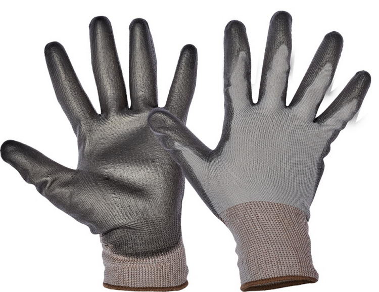 Polomáčené polyesterové rukavice, bezešvé, s vrstvou polyuretanu. Jsou vhodné pro ovládání dotykových obrazovek.