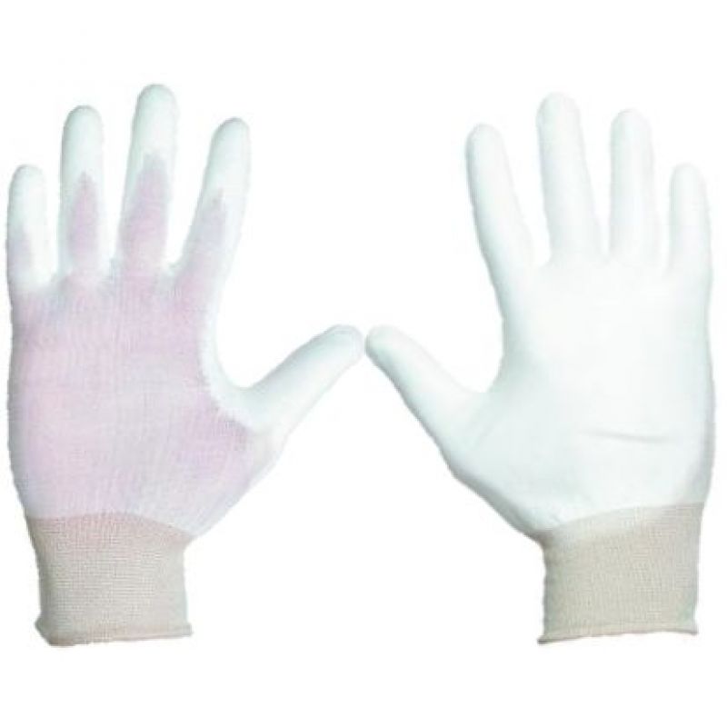 Jemný bílý nylon s pružnou manžetou, dlaň a prsty pokryté polyuretanem