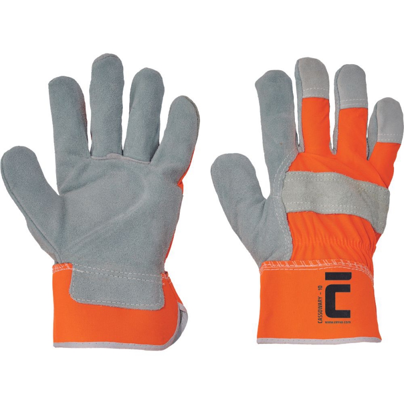 Rukavice z jednobarevné hovězí štípenky v dlani s podšívkou a polyesterového úpletu v reflexní barvě na hřbetu a manžetě.
