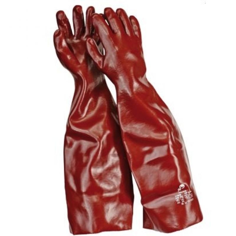 Rukavice z bavlněného úpletu máčené v PVC, odolné mechanickým a chemickým rizikům, v celkové délce 60 cm.