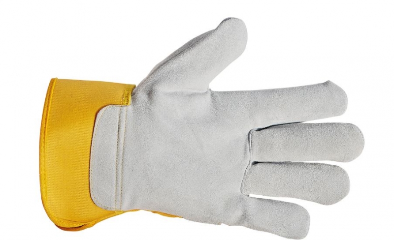 Kombinovaná rukavice z hovězí štípenky a bavlněné tkaniny. Pevná manžeta o délce 7 cm.