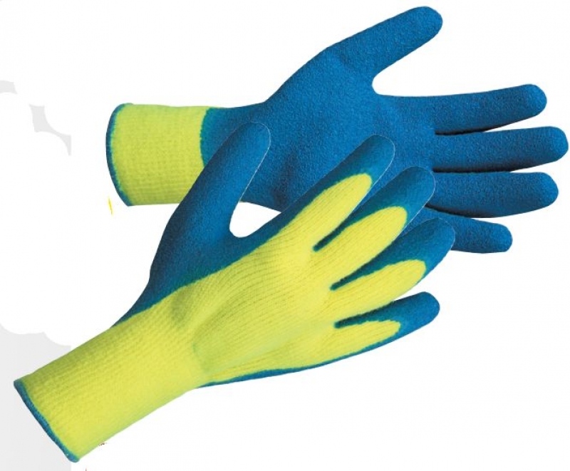 Zimní rukavice z akrylu, máčené v modrém latexu.