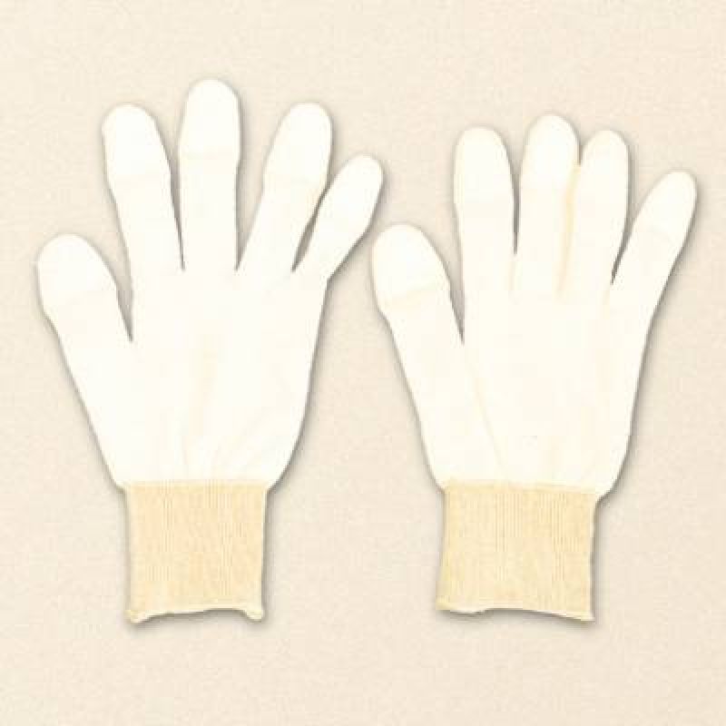 Jemný bílý nylon s pružnou manžetou, špičky prstů pokryté polyuretanem