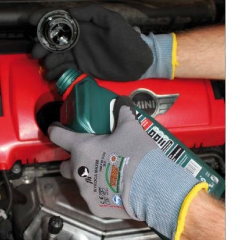 Rukavice z úpletu nylon/lycra máčené v mikroporézním nitrilu, excelentní prodyšnost, velmi dobrý úchop za mokra, v olejnatém prostředí i za sucha.