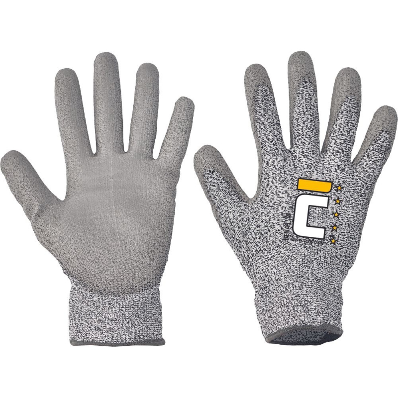 Pletené bezešvé rukavice s obsahem vlákna DYNEEMA a nylonu s vysokou odolností proti prořezu ostřím, s vrstvou šedého PU v dlani a na prstech.