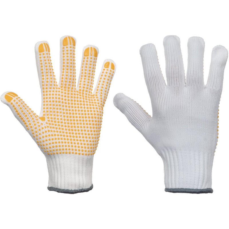 Pletené bezešvé rukavice ze směsi nylonu a skelného vlákna. Se žlutými PVC terčíky v dlani a na prstech. Kategorie prořezu C