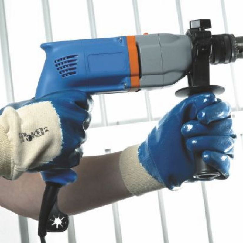 Rukavice šité z bavlněného úpletu, polomáčené v nitrilu a s pletenou manžetou. Velikosti: 8”–11”