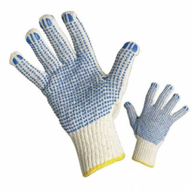 Pracovní rukavice - Bezešvý bílý polyesterový úplet s pružným zápěstím, dlaň, hřbet a prsty s modrými PVC terčíky
