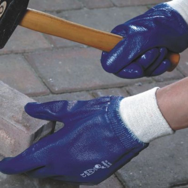 Rukavice šité z bavlněného úpletu, máčené v nitrilu a s pružným nápletem. Velikost: 10”