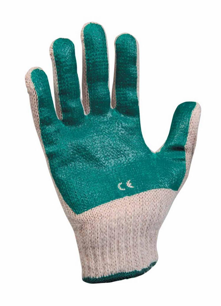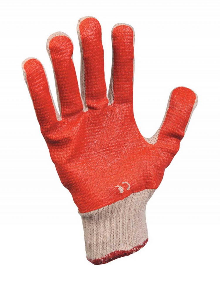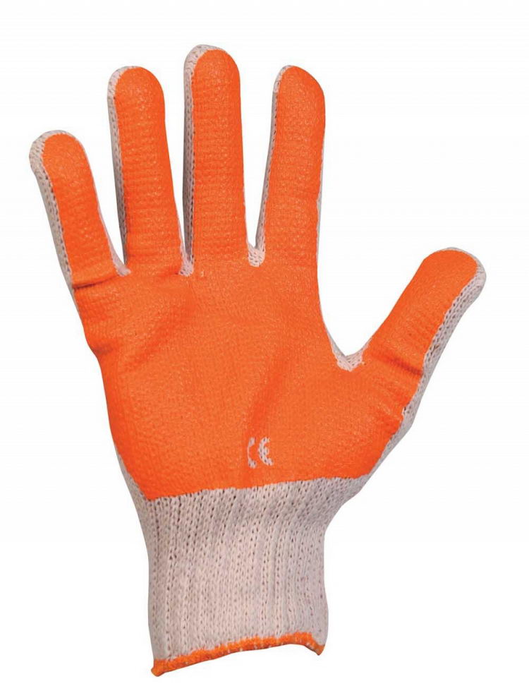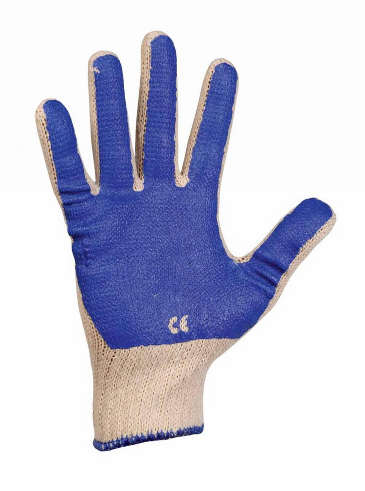 Pletené bezešvé bavlněné různobarevné rukavice, polomáčené v barevném PVC v dlani a na prstech, s pružnou manžetou. Velikosti 7,8,9,10.