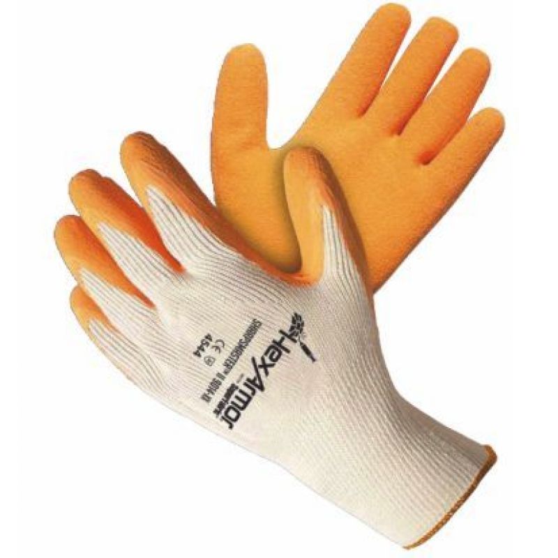 Bezešvé pletené rukavice ze syntetického materiálu, polomáčené v latexu, se zvrásněním a patentovanou vložkou proti propíchnutí a prořezu v dlani a na prstech, lze je prát. Velikosti: 7”-11”