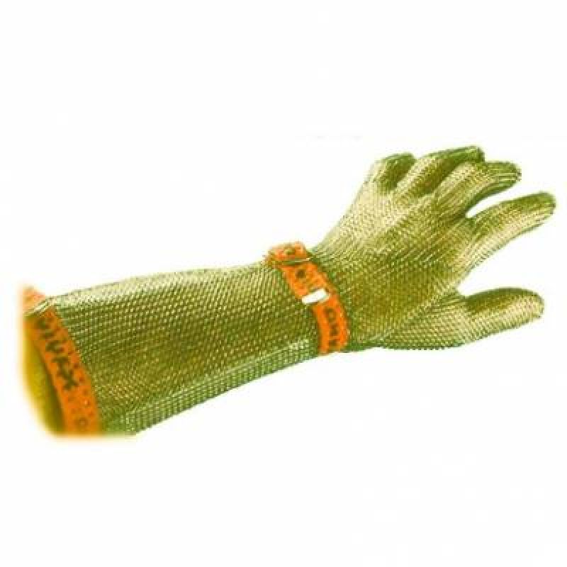 Pracovní rukavice neprořezové z nerezových kroužků, textilní řemínek, obouruké, prodloužený chránič předloktí