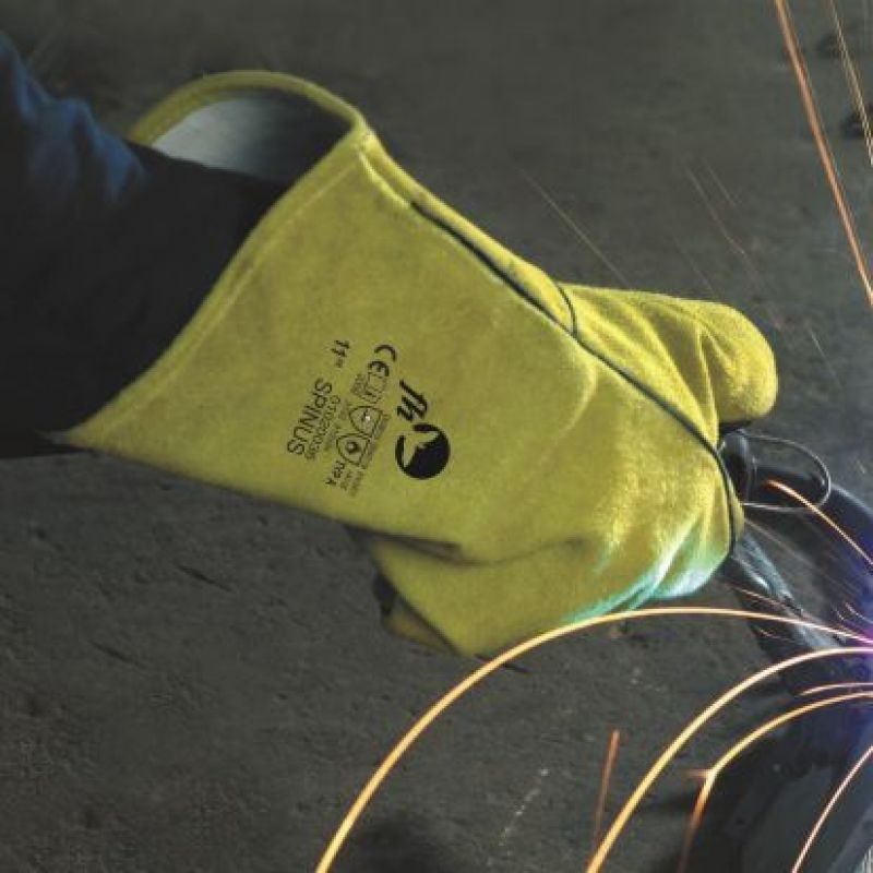 Rukavice ze žluté hovězí štípenky s krytými švy šitými kevlarovou nití, bavlněnou podšívkou a v délce 35 cm. Certifikát: svářečské práce – TYP A Velikost: 11”