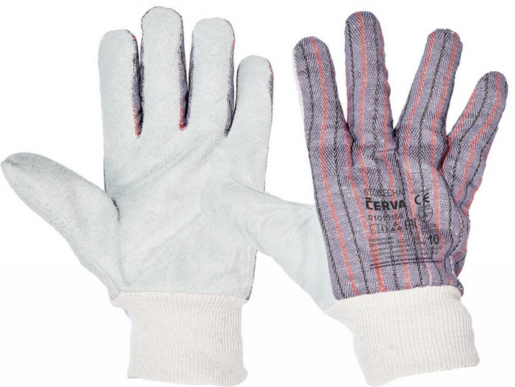 Rukavice z hovězí štípenky v dlani s podšívkou, hřbet a manžeta z tkaniny. Pružná manžeta.