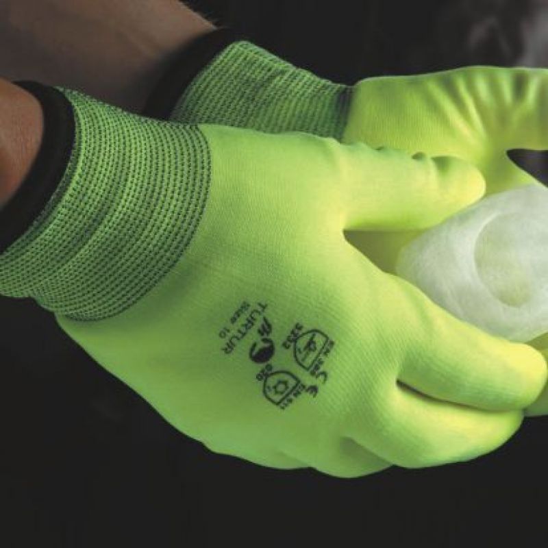 Pletené, bezešvé, zateplené, nylonové rukavice s nánosem PVC v dlani a na prstech, silnou podšívkou, pružnou manžetou a v bareveném provedení výstražná žlutá. Velikost: 10”