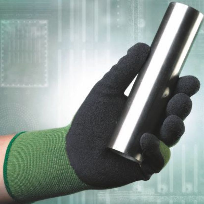 Bezešvé pletené rukavice, polomáčené v černém latexu, s bambusovým vláknem a zvrásněním na prstech pro lepší úchop. Velikosti: 7”–10”