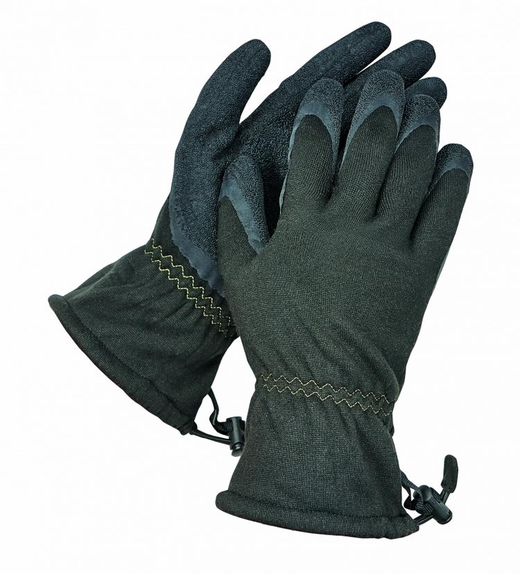 Šité polyesterové rukavice z fleecu polomáčené v latexu, pružná oblast zápěstí ze směsi nylon/lycra. Dlouhá stahovací manžeta.