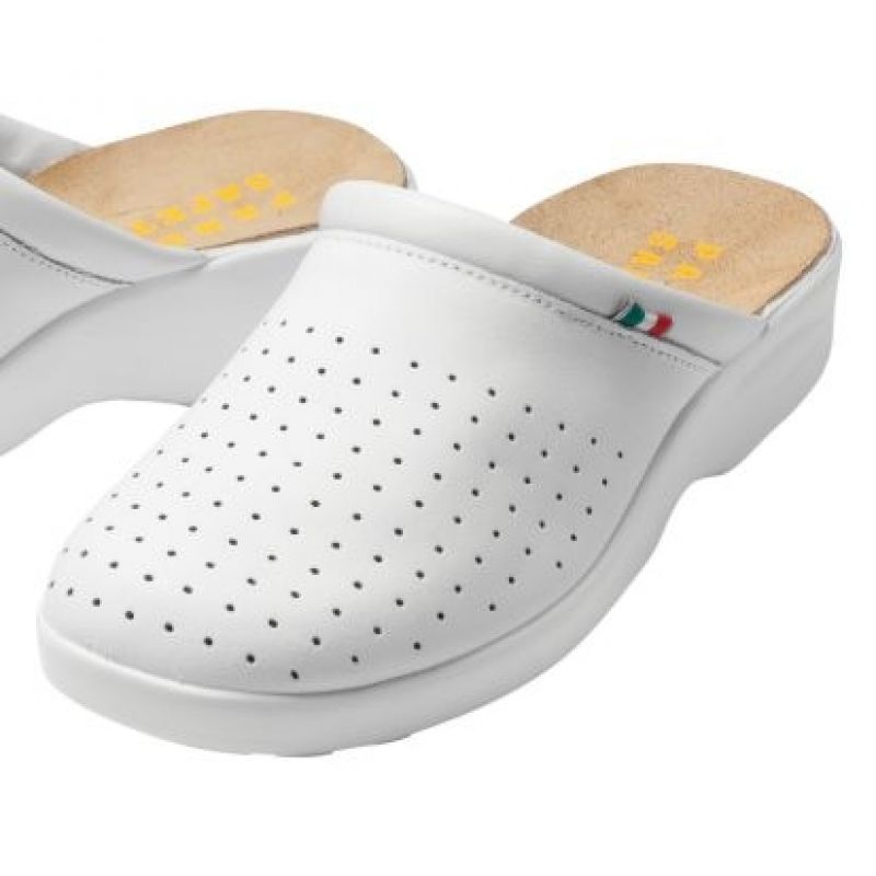 Pracovní pantofle s PU podrážkou a perforovaným koženým svrškem.
