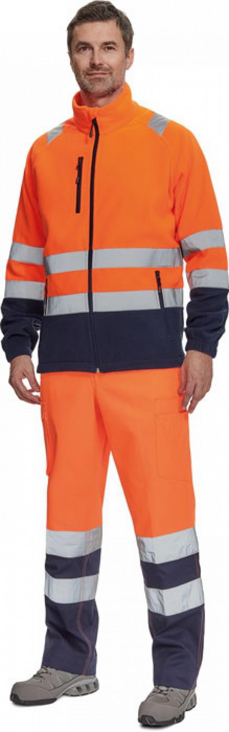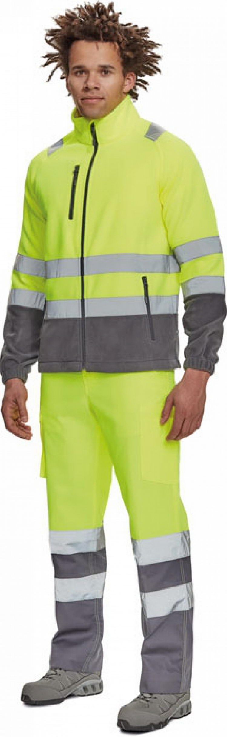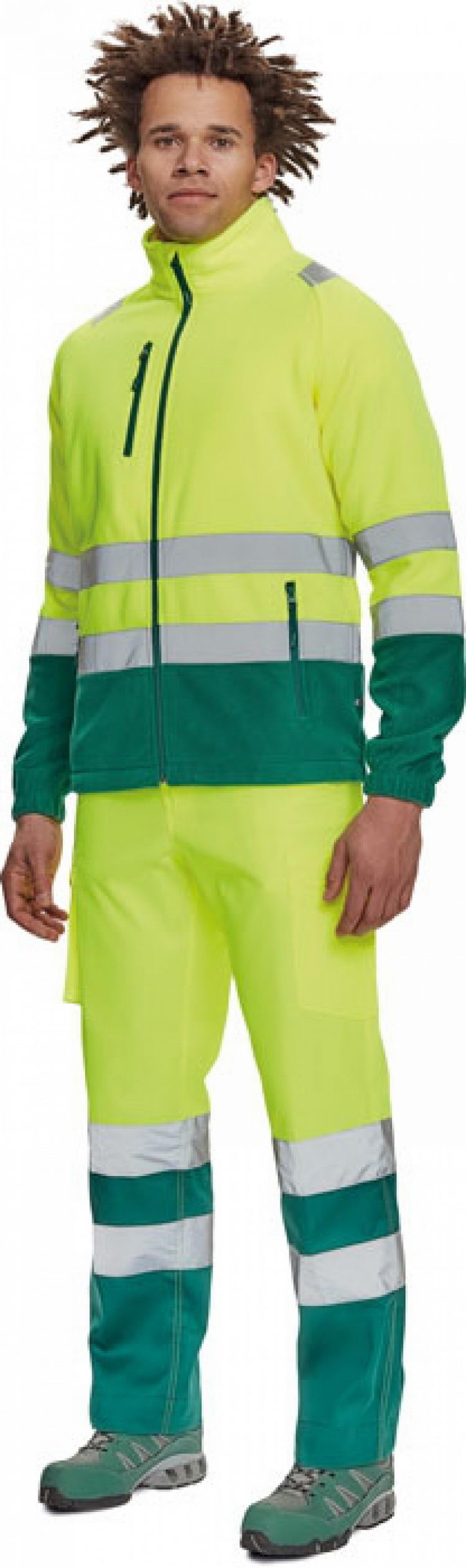 pánská Hi-Vis fleecová bunda s retroreflexními pruhy přes ramena, v bocích a na rukávech, zapínání na zip, 1 náprsní kapsa a 2 postranní kapsy na zip, elastické lemy rukávů a boků