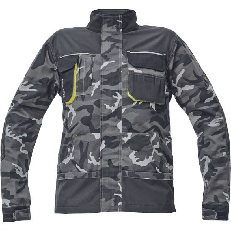 pánská pracovní bunda, zapínání kryté légou na suchý zip; v moderní úpravě šedé kamuflážové barvy; 2 přední kapsy, 2 náprsní kapsy; 1 náprsní kapsa na mobilní telefon; Oxford 600D zesílení loktů; reflexní prvky; kontrastní prošití.