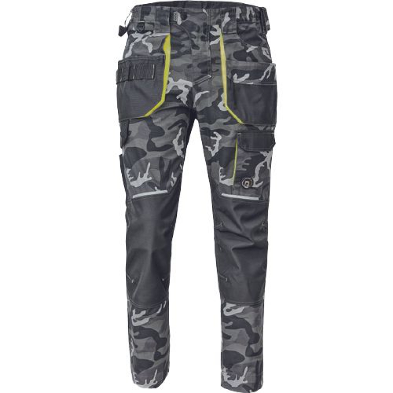 pánské pracovní kalhoty s pružným pasem a multifunkčními kapsami; v moderní úpravě šedé kamuflážové barvy; Oxford 600D zesílení kolenních kapes pro vkládání ochranných nákoleníků; odolné trojité prošití nohavic a sedu; reflexní prvky; nastavitelná délka nohavic.