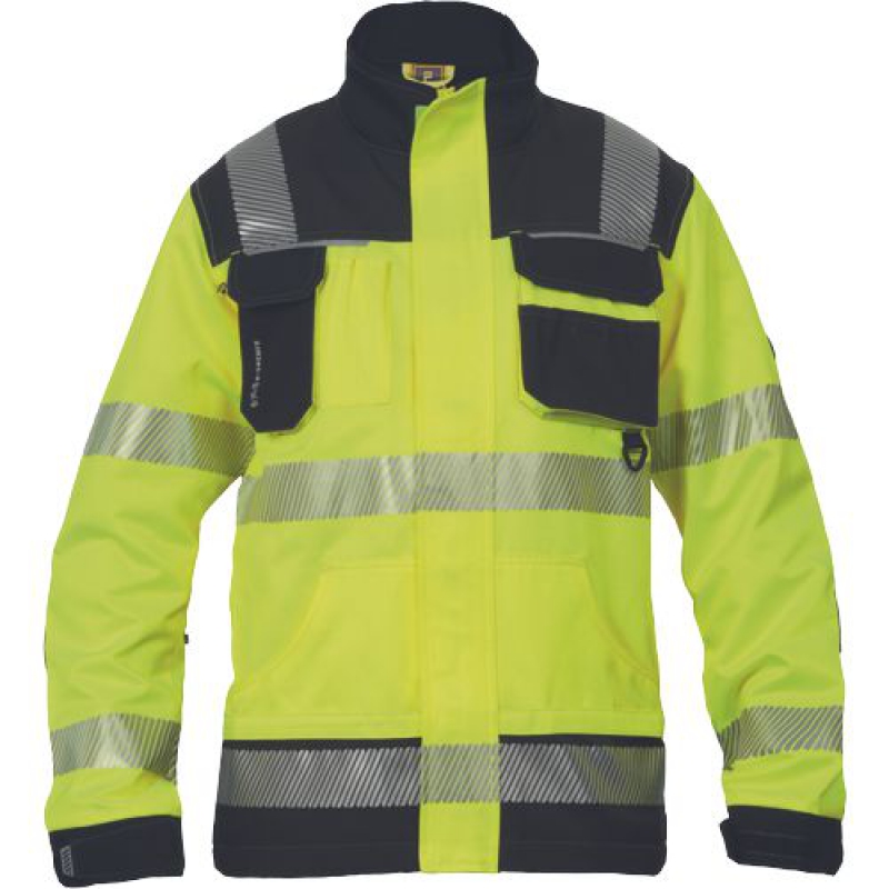 pánská pracovní HI-VIS bunda; zapínání kryté légou na suchý zip; 2 přední kapsy, 2 náprsní kapsy; 1 náprsní kapsa na mobilní telefon; Oxford 600D zesílení loktů a ramen; tištěné reflexní segmentované 5 cm pruhy okolo pasu, rukávů a přes ramena; kontrastní prošití.