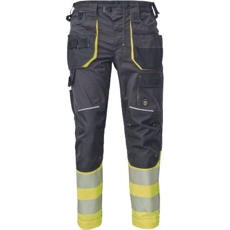 pánské pracovní HI-VIS kalhoty s pružným pasem a multifunkčními kapsami; Oxford 600D zesílení kolenních kapes pro vkládání ochranných nákoleníků; odolné trojité prošití nohavic a sedu; 2 tištěné reflexní segmentované 7 cm pruhy na spodní části nohavic; nastavitelná délka nohavic.