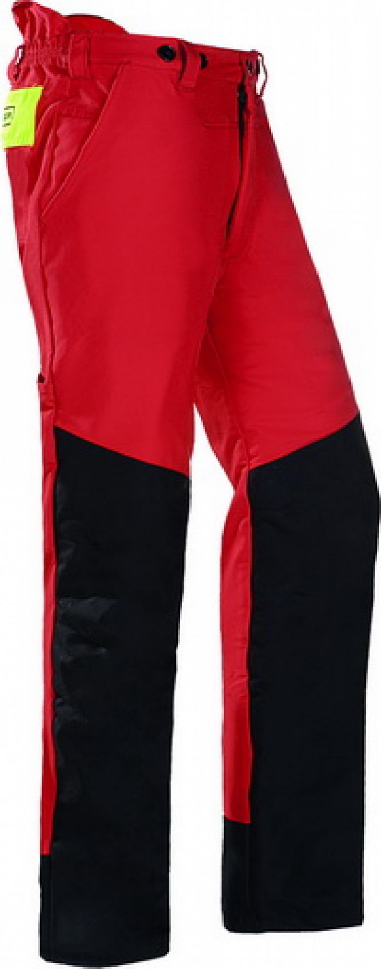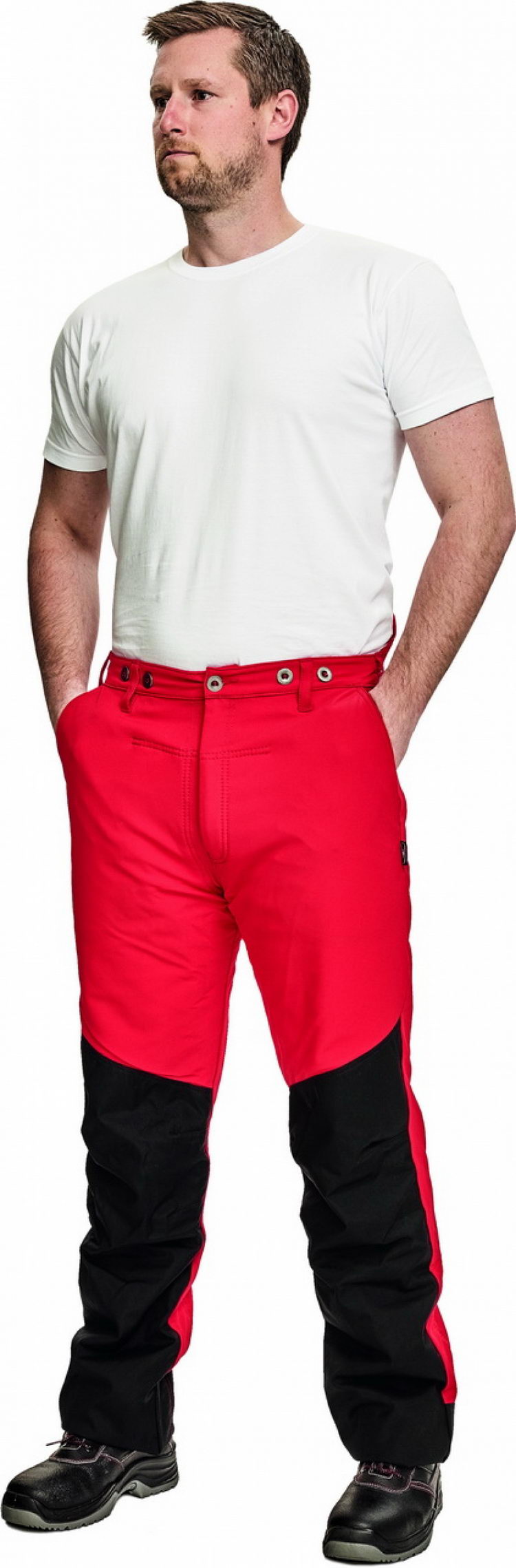 Protipořezové kalhoty • vodě odolná membrána Hydura® použita jako vyztužení na přední straně nohavic • zapínání poklopce na zip • dvě kapsy jeansového typu • jedna kapsa na metr • elastický pas s oky na pásek a s knoflíky na připnutí šlí • dvojité prošití vnitřní strany pravé