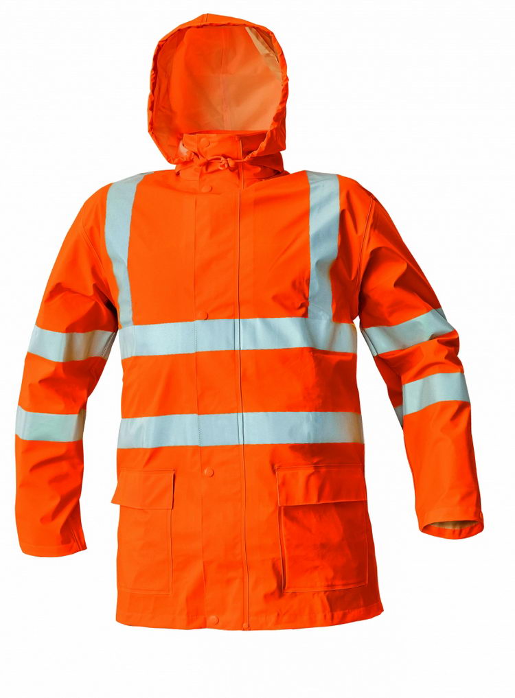 nepromokavý a větruodolný komplet, ¾ plášt s kapucí v límci a kalhoty s gumou v pase, nešustivý materiál, dve široké přední kapsy kryté légami proti průniku vody, spodní lem rukávu lze polohovat drukem