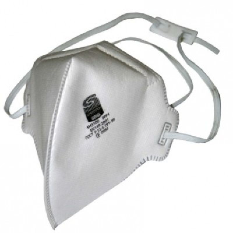 Jednorázová skládaná filtrační polomaska třídy FFP1D proti netoxickým pevným částicím a kapalným aerosolům v koncentracích nepřevyšujících 4,5 násobek NPK.