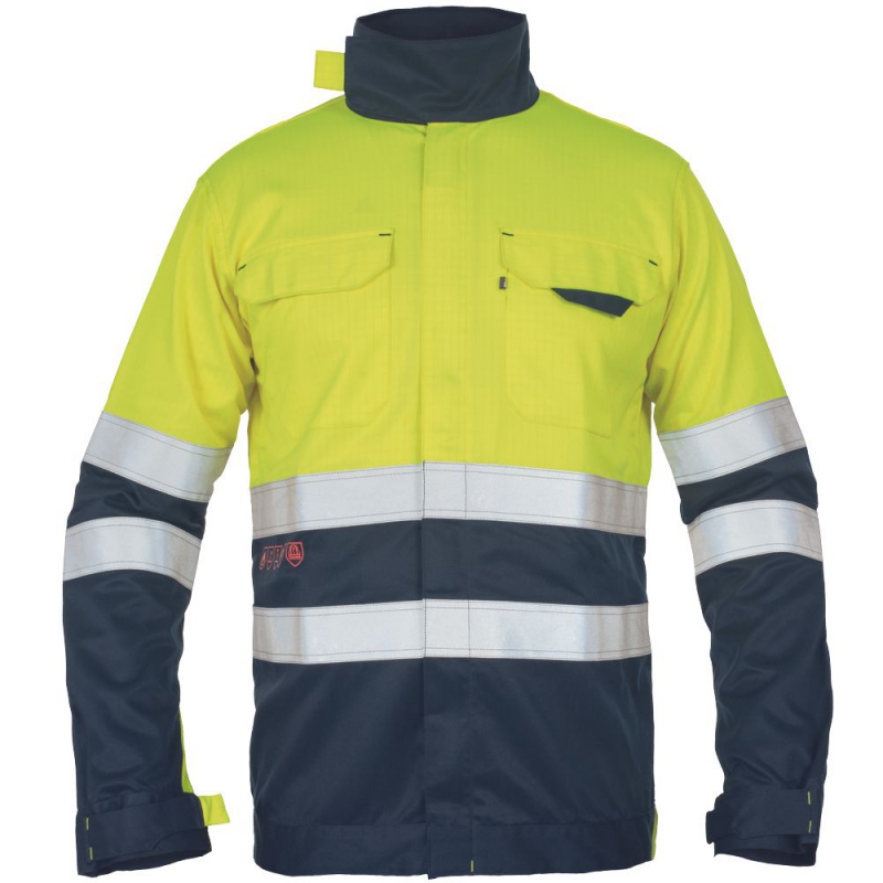 HI-VIS multinormní bunda se zapínáním na zip krytým légou na suchý zip; 2 náprsní kapsy s klopou na suchý zip; dvojice 5 cm šitých reflexních pruhů okolo rukávů a boků; nastavitelný obvod manžet rukávů o límce pomocí suchého zipu.