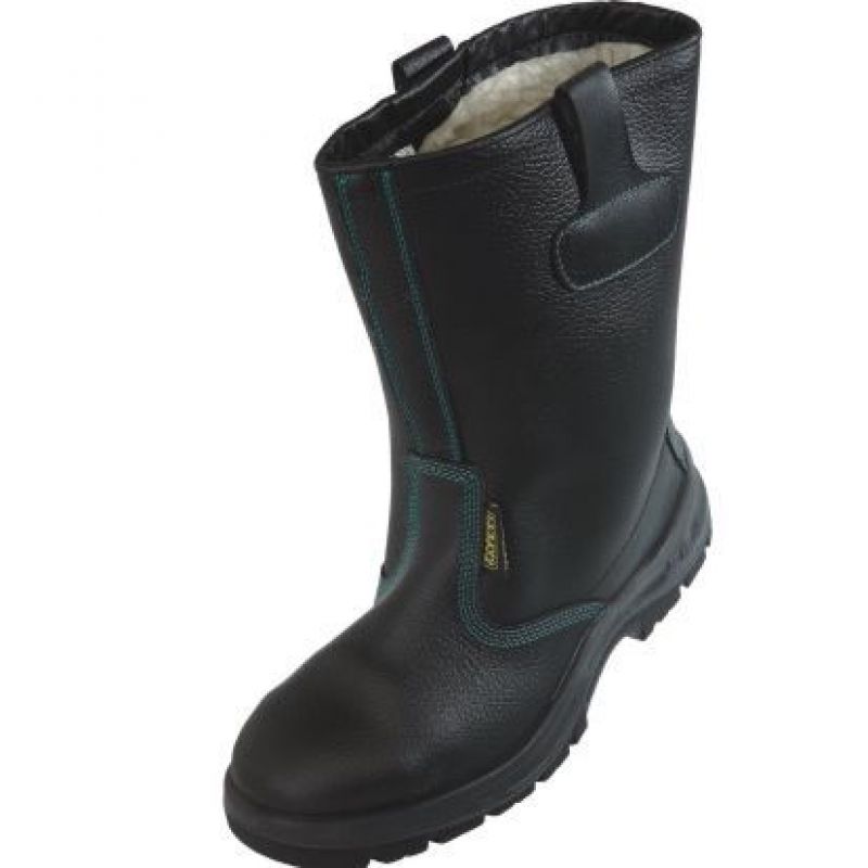 Bezpečnostní zateplená nazouvací vysoká obuv s ocelovou tužinkou, antistatickou a protiskluzovou podrážkou rezistentní pohonným hmotám, absorpcí energie v patě a voděodolným svrškem z prodyšné kůže.