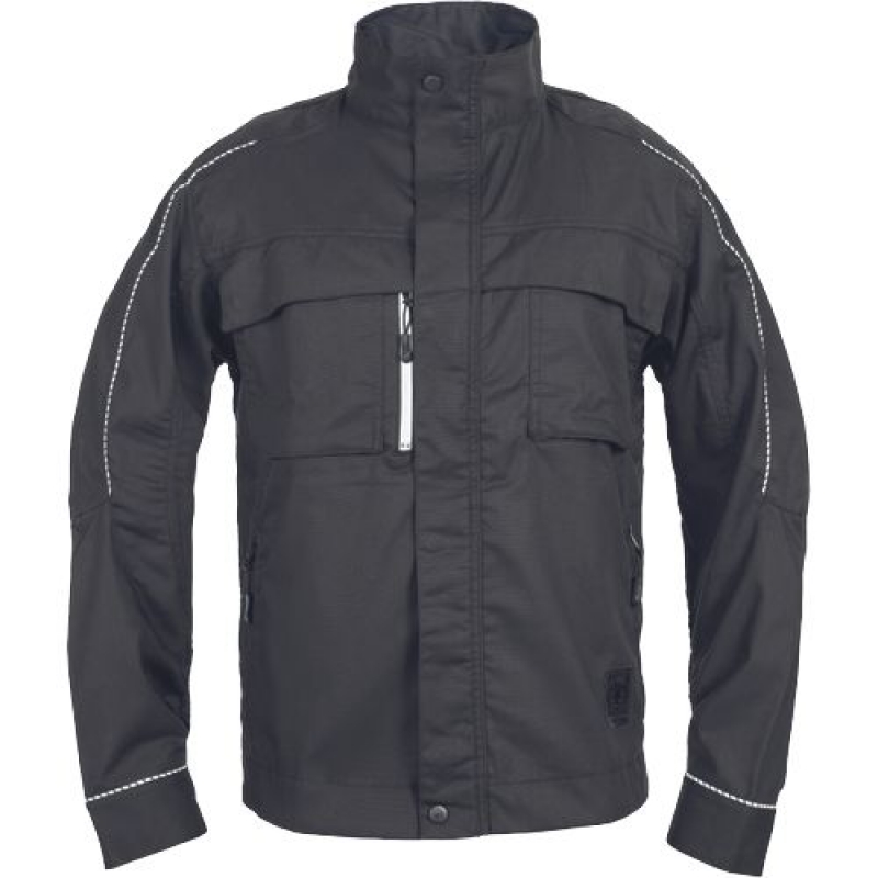 moderní pánská pracovní bunda se zapínáním na zip krytým légou na druky; 2 náprsní kapsy s klopou; 1 Napoleon kapsa vpravo; 2 boční kapsy na zip; nastavitelný obvod manžet rukávů pomocí druků; reflexní paspulky pro lepší viditelnost.