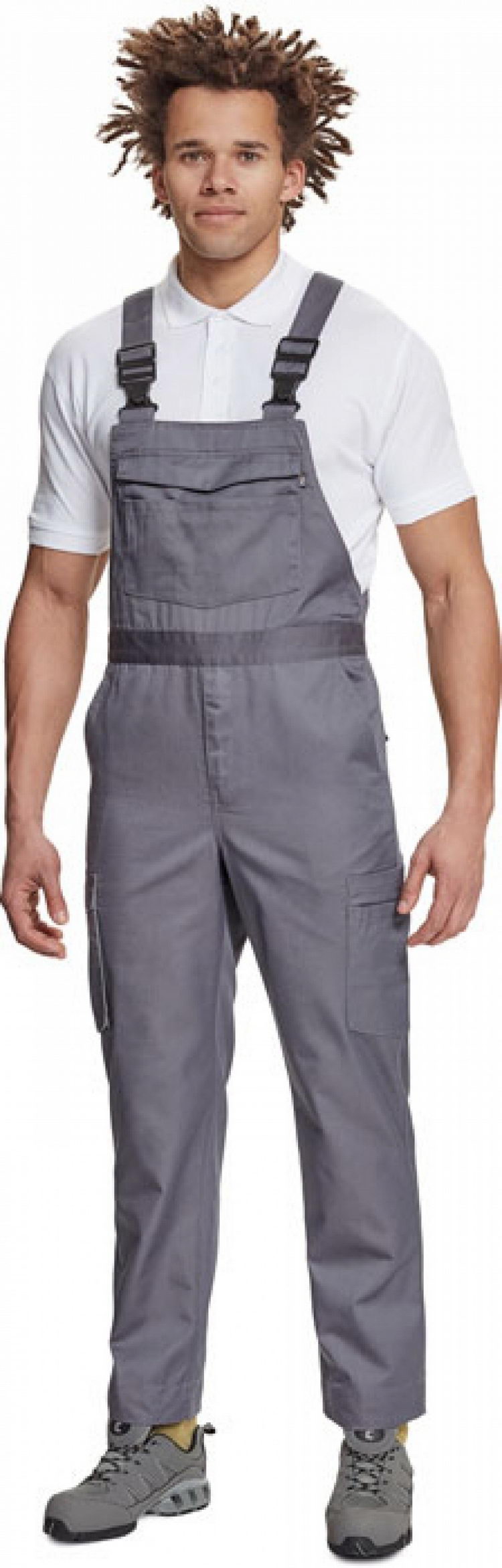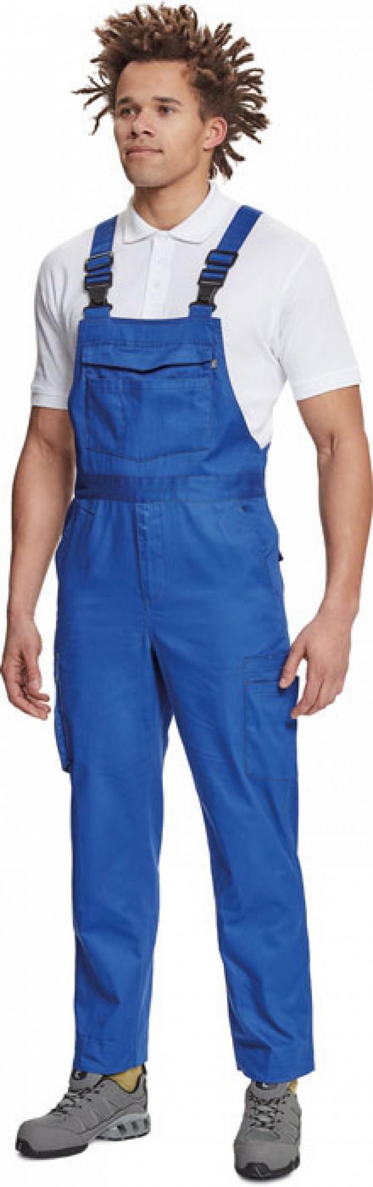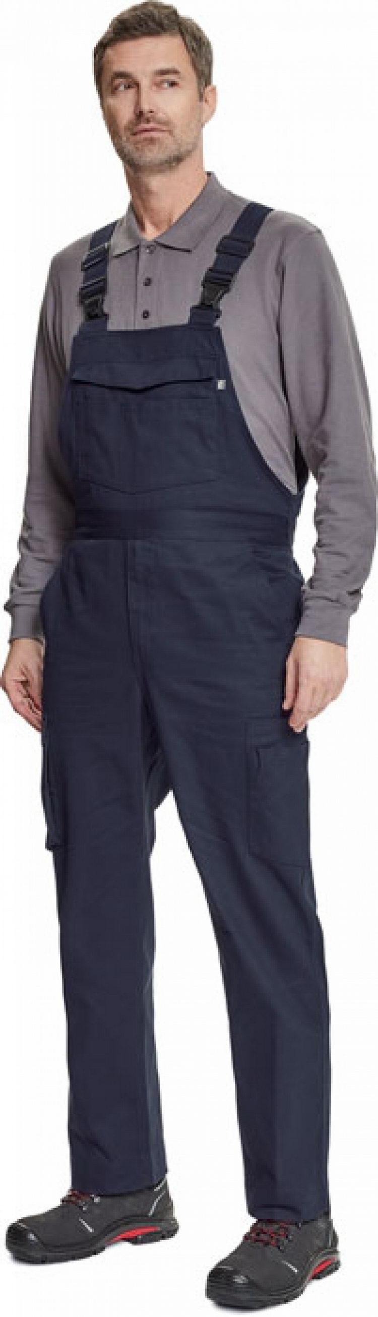 pánské pracovní kalhoty s laclem, elastický pas, 2 boční kapsy + 1 kapsička na drobné, 2 multifunkční stehenní kapsy, 2 zadní kapsy, 1 velká multifunkční náprsní kapsa, elastické šle se zapínáním na sponu, nastavitelná délka nohavic